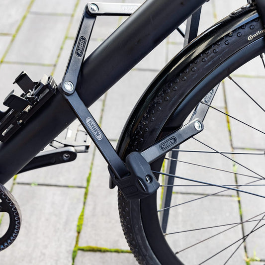 The shape of the folding lock is reminiscent of a carpenter's tape measure. Pleasant to handle, more effective than cables and less cumbersome than U-locks when folded, it does not rival the latter in terms of protection. The connection points between the various flat steel bars are weak points. The folding lock should be reserved for short stops.