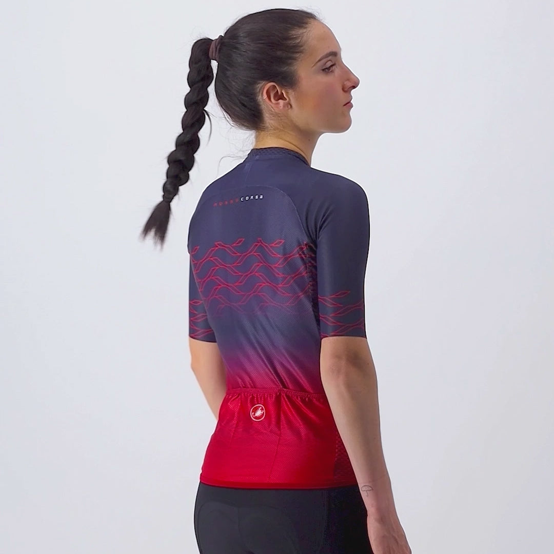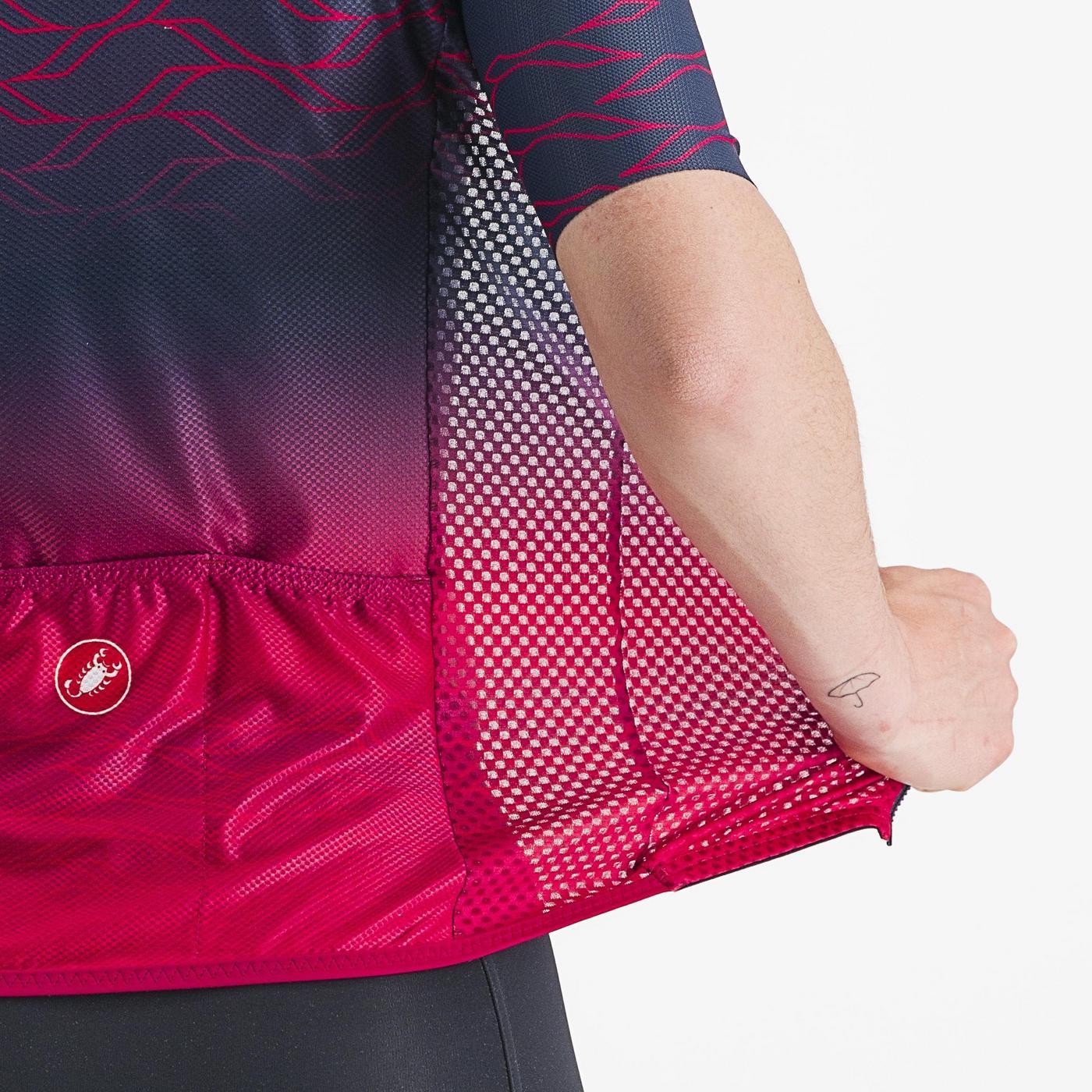 The CASTELLI CLIMBER'S 2.0 W Womens Short Sleeve Jersey is specially designed for hot days. Its fabric Flusso 3D fabric at the front ensures excellent air circulation and fast drying, while the StradaPro 3D on the back blocks over 90% of UV rays.