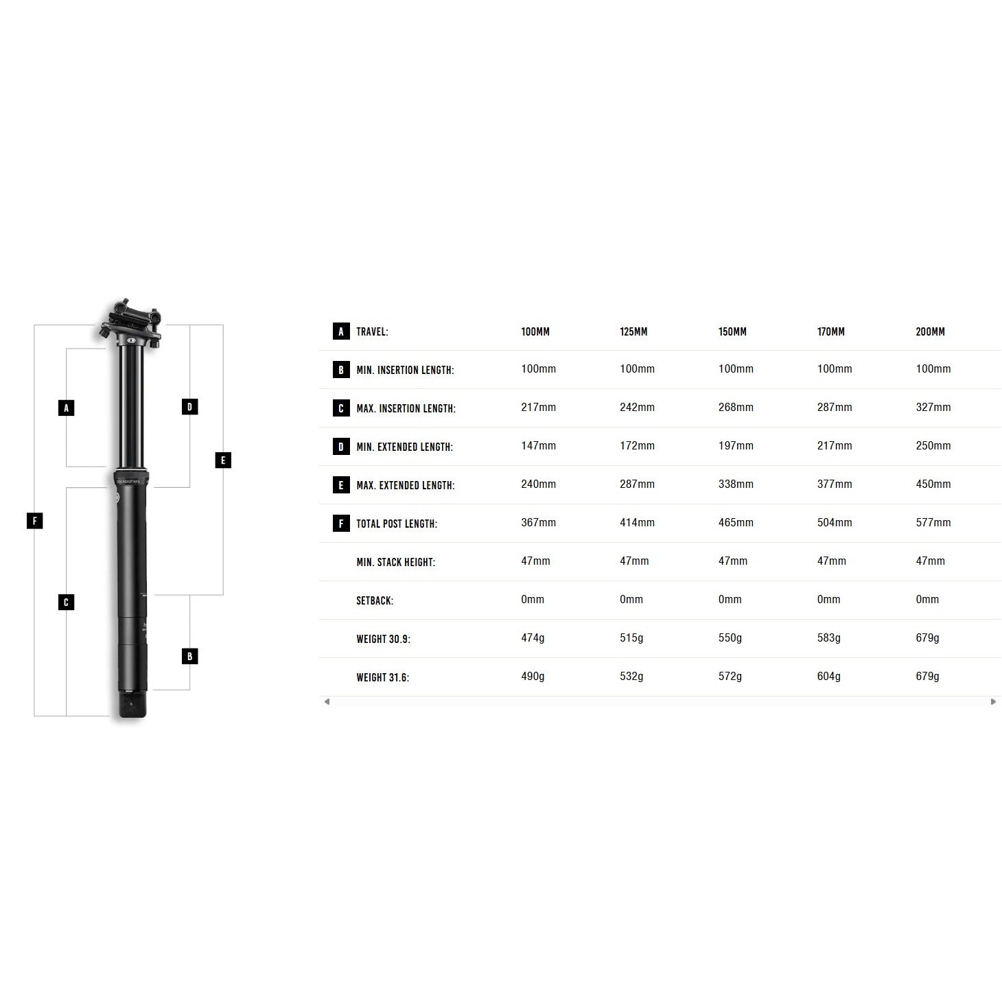 Weight (manufacturer) in 125mm: 30.9: 515g, 31.6: 532g