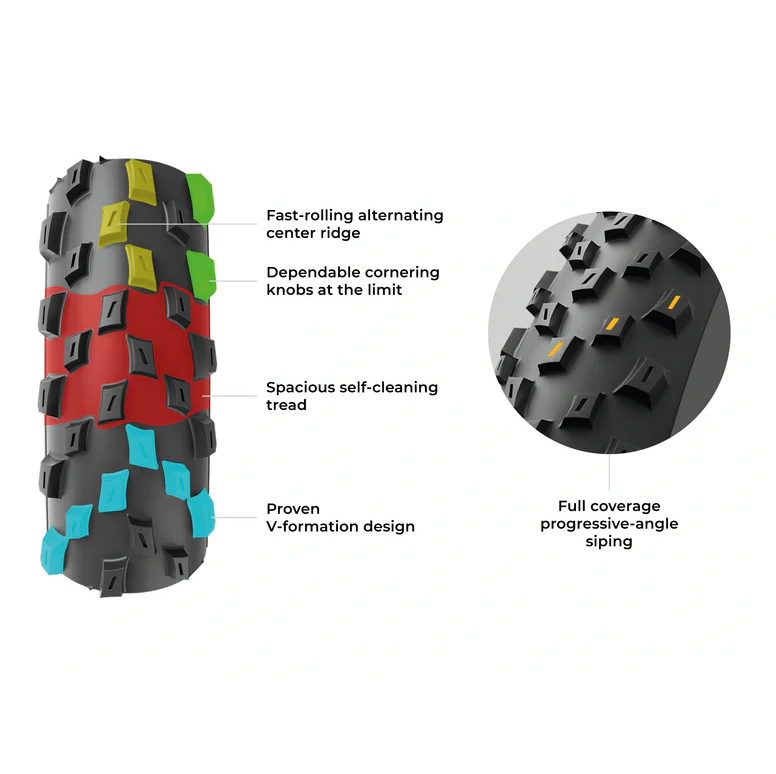 Sa carcasse Trail tubeless-ready en nylon 60 TPI est renforcée avec une protection latérale et une ceinture anti-crevaison, assurant résistance aux impacts et sécurité sur les descentes agressives. Le Bead Shield renforce le talon pour une tenue parfaite sur la jante, même en basse pression.