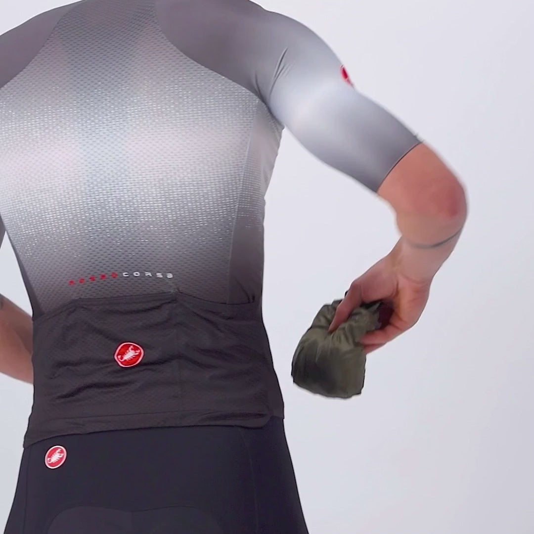 Elastyczna siateczka w paski z tyłu zapewnia doskonałą oddychalność i zapobiega trzepotaniu materiału na wietrze, gwarantując doskonałą aerodynamikę. Praktyczna i funkcjonalna, składa się do bardzo kompaktowych rozmiarów, idealnych do schowania w kieszeni, gdy zniknie potrzeba ochrony.