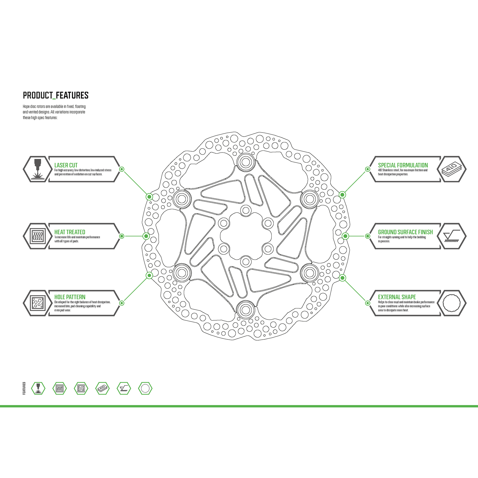 Wyprodukowany w północnym Manchesterze pływający dysk HOPE jest kompatybilny z X2, E4 oraz V4. Idealna dla rowerzystów szukających wydajności, ale także dla poszukiwaczy wrażeń szukających odrobiny "ekstra", ta tarcza oferuje stosunkowo dużą powierzchnię hamowania dla większej wszechstronności.