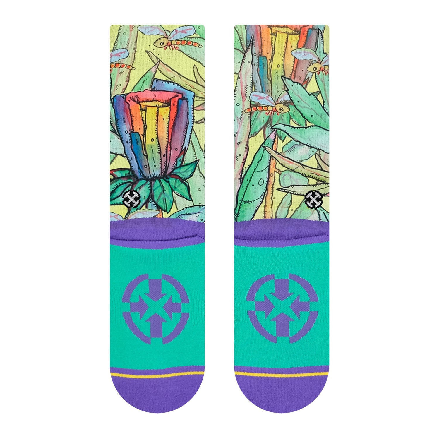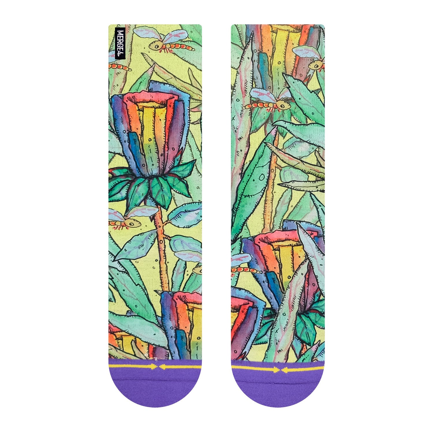 The Skarpety MERGE4 BAD OTIS LINK RAINBOW FLOWER, ilustrowane przez artystę Bad Otis Link, łączą styl i wydajność z unikalnymi wzorami, które nie pozostaną niezauważone. Ich bezszwowa konstrukcja palców i pięta w kształcie litery Y zapewniają optymalny komfort.